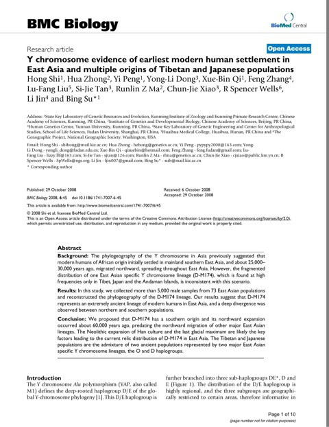 Y遺伝子の研究論文(引用)、日本人の多くがD1、羌(チャン)族がD1を持ち同一祖先のDから分岐したことの証明